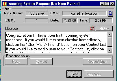 A window with an Incoming System Request will pop up on the screen that explains a few of ICQ's functions. When you have finished reading the message, click on Close.